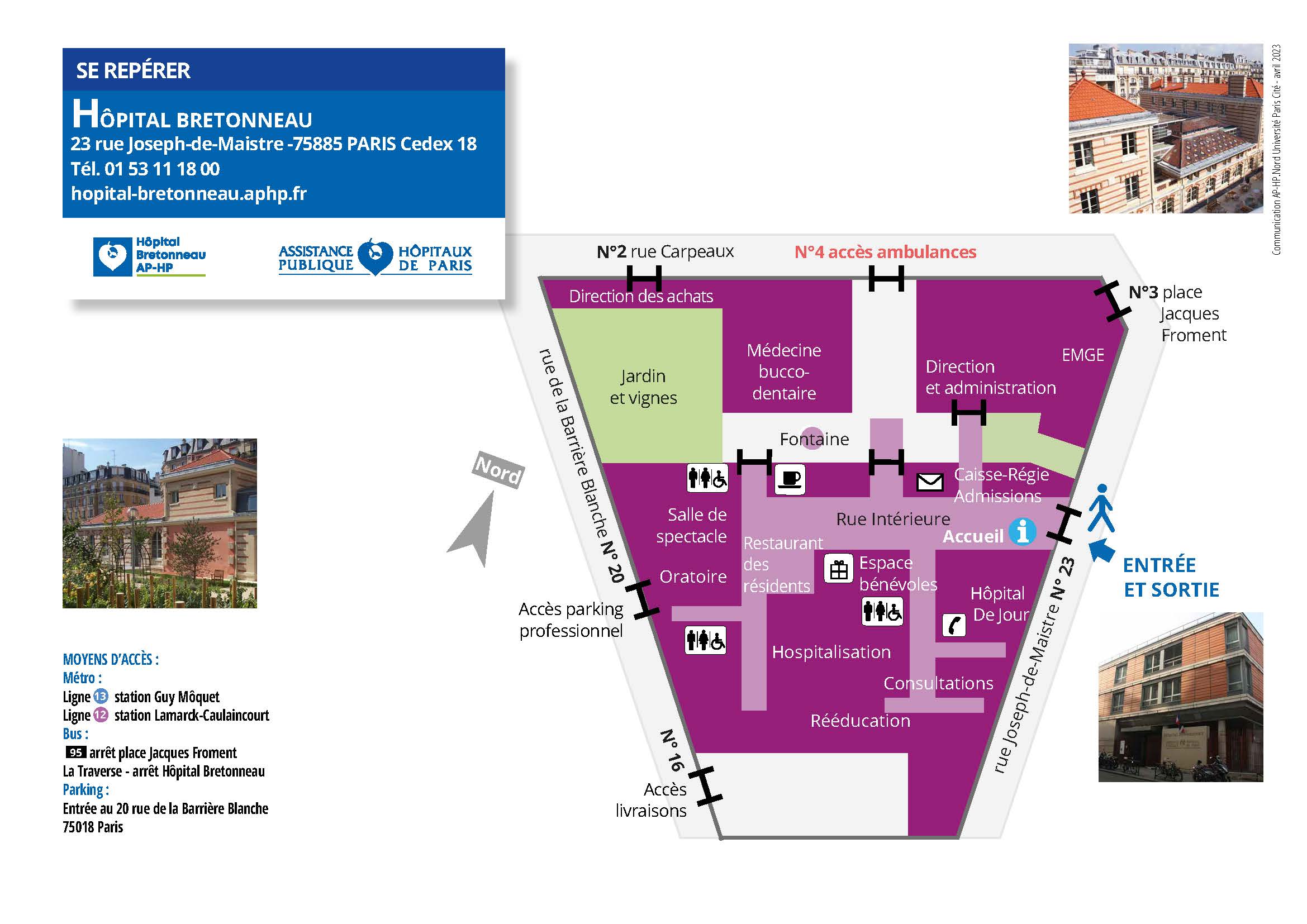 Situé dans le 18e arrondissement de Paris, tout près de Montmartre, Bretonneau est un hôpital moderne dédié à la personne âgée. Il est composé de trois bâtiments principaux : l’un construit en 2001 et les deux autres datant de 1900 rénovés en 2001 et 2006.