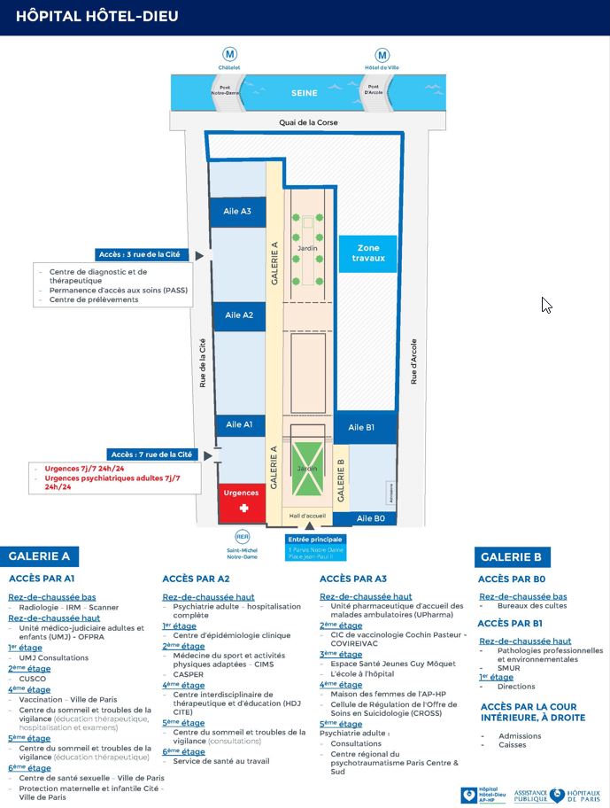 Hôpital de proximité et de spécialités situé au cœur de l’Île de la Cité dans le 4e arrondissement de Paris, l’Hôtel-Dieu propose des disciplines hospitalo-universitaires qui s’appuient sur un service d’imagerie (dont IRM et Scanner) et de biologie moderne et performant :- un service d'accueil des urgences ouvert 24h/24 et 7j/7