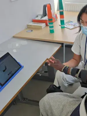La stimulation électrique fonctionnelle génère la flexion et l’extension du poignet et des doigts atteints d’un déficit lié à une pathologie neurologique.